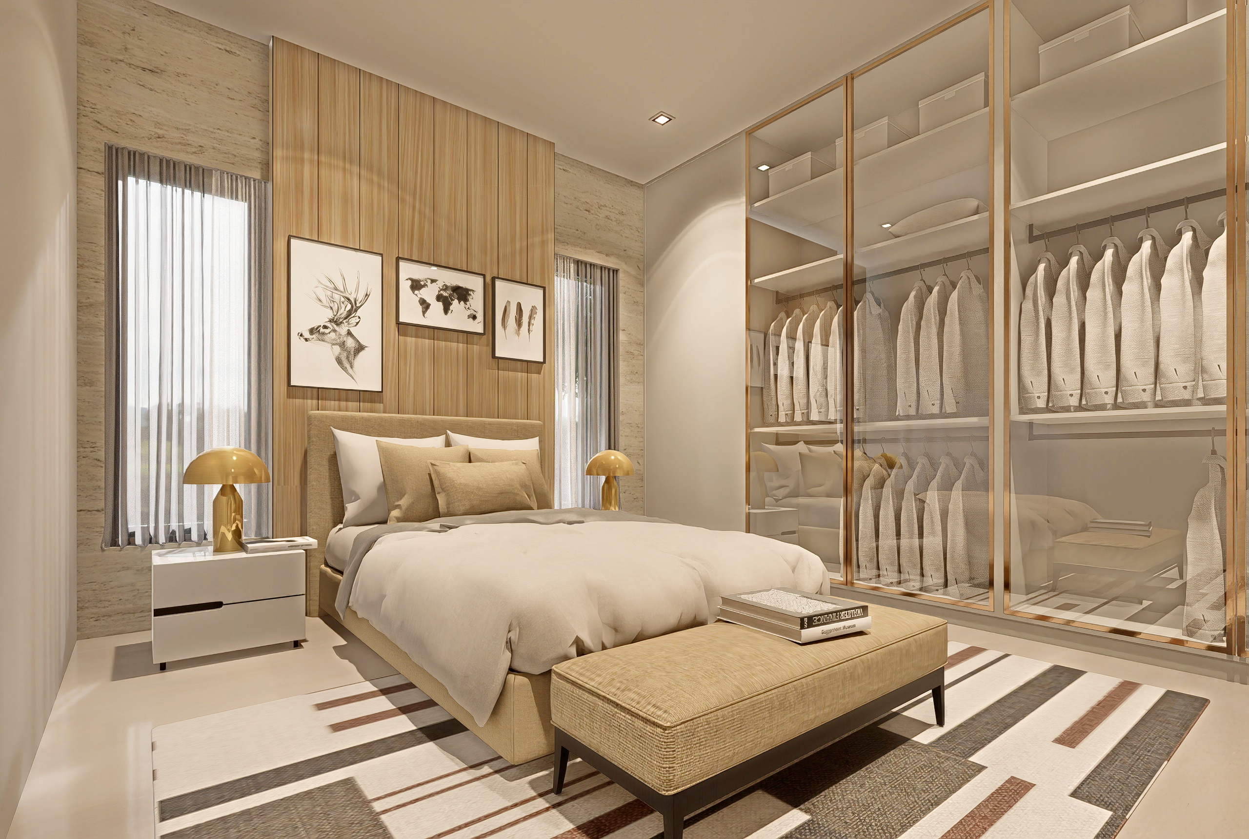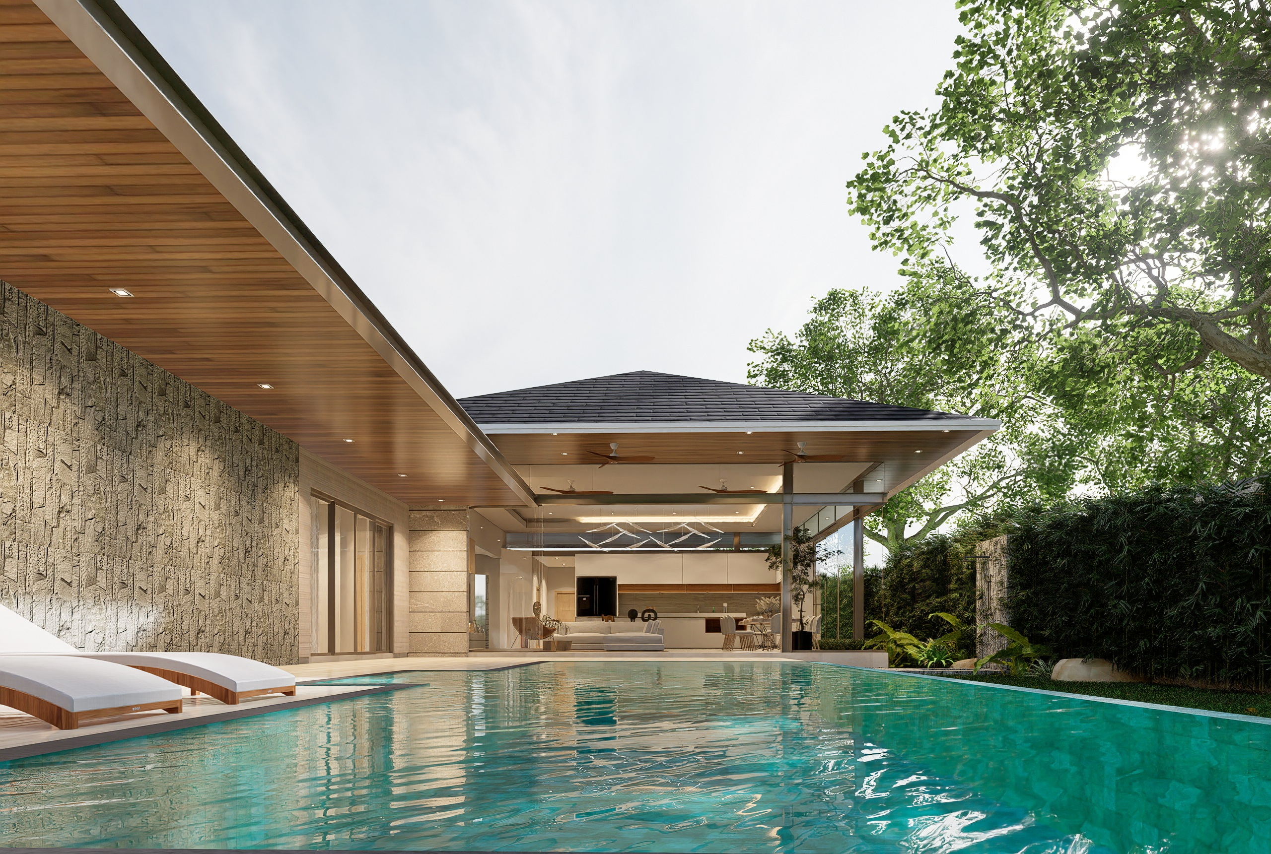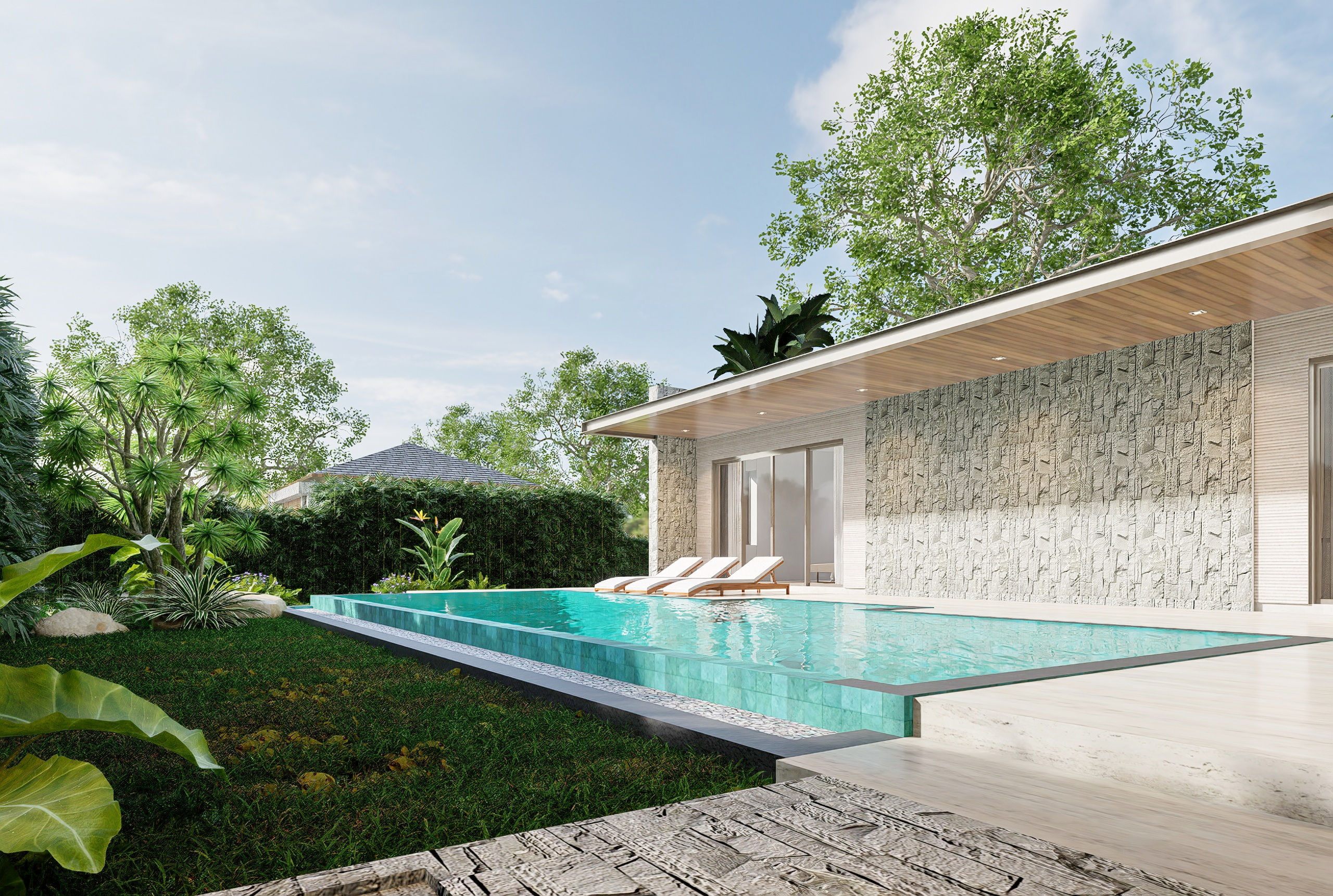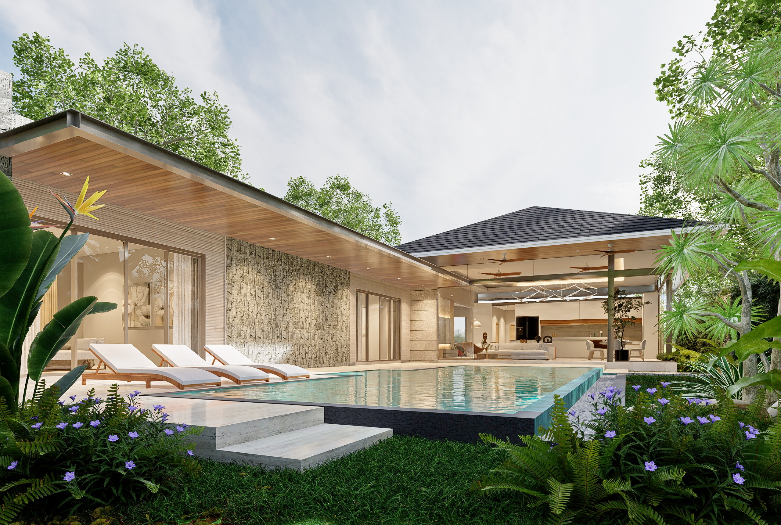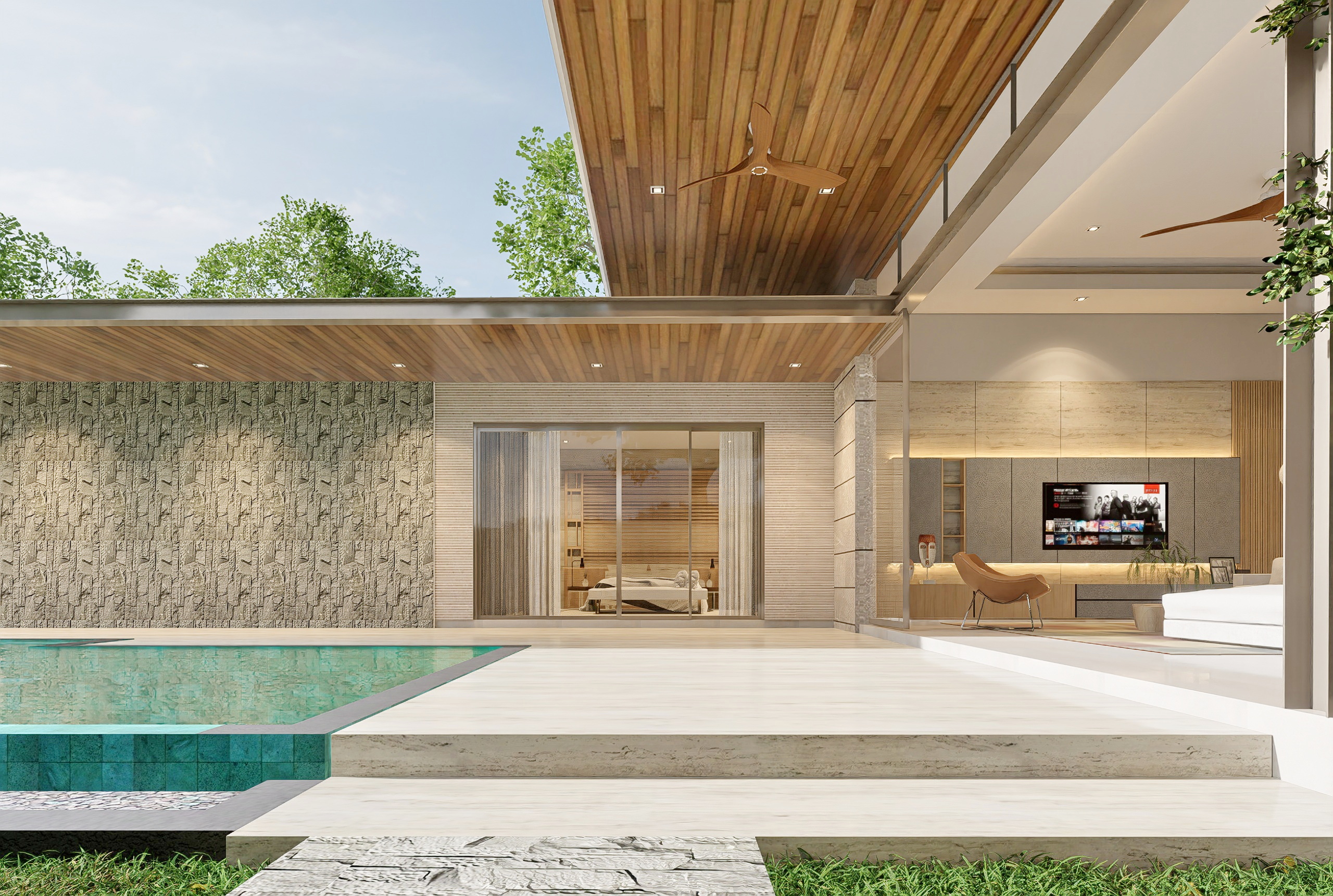 Villa Type B is designed for those who seek extra space and refined living. With 450 sqm of thoughtfully crafted interiors, this villa features 3 bedrooms, 3 bathrooms, a powder room, and a private office, making it ideal for families or professionals working from home. The elegant stone wall finishes, high-quality built-ins, and a luxurious 4×10 meter pool create an atmosphere of both warmth and sophistication.